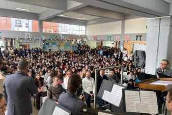 A Escola Dr. Flávio Gonçalves acolheu esta semana um concerto pedagógico da Banda do Exército (Destacamento do Porto). O evento inseriu-se na celebração do Dia Europeu da Música nas Escolas (EuDaMus), uma iniciativa que promove a criatividade e a expressão artística, destacando a música como ferramenta essencial para o desenvolvimento das crianças. Os professores Filomena Oliveira e Maurício Costa dinamizaram várias atividades para assinalar a data, mas o ponto alto foi o convite para uma visita e atuação da Banda do Exército. Centenas de alunos e professores puderam assistir a uma demonstração musical que se transformou num momento de grande animação e de aprendizagem para todos os presentes, tendo encerrado com a entoação do hino nacional “A Portuguesa”.
